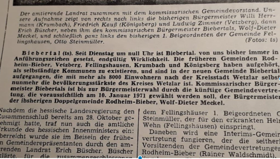 Besonders voran getrieben hat das Projekt „Biebertal“, also den Zusammenschluss der damals selbständigen Gemeinden Rodheim-Bieber, Fellingshausen, Königsberg, Krumbach und Vetzberg,