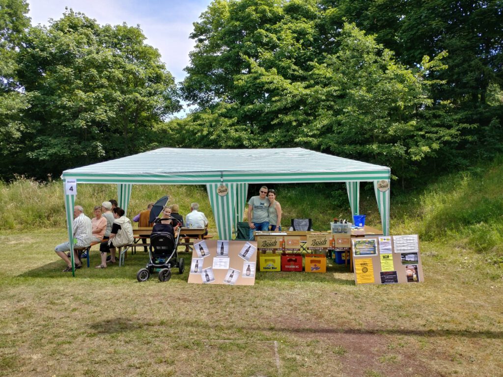 Wie bei dem OpenAir Fest letztes Jahr werden auf dem Sportplatz Parzellen errichtet, die man buchen kann. Für jede Parzelle sind 10 Leute erlaubt und so eine Parzelle kostet 10 € als Miete. Dazu kommen dann noch 3,50 € als Pfand für das 0,1 l Gläschen.