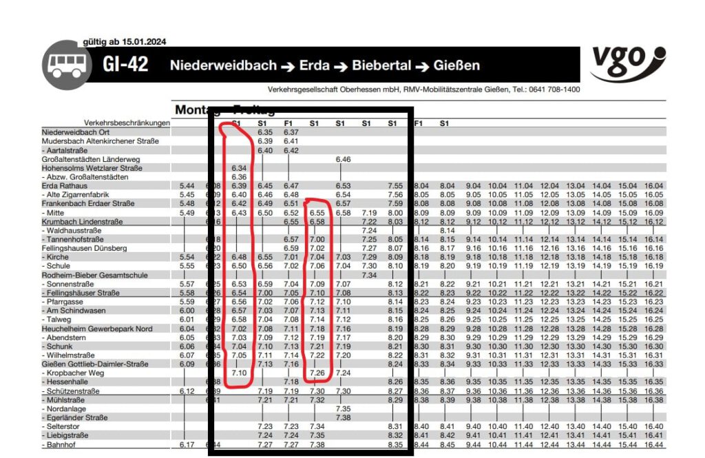 Der Fahrplan für die Linie Gi-42 wurde erneut angepasst. Es betrifft aber nur morgens die Busse, die Richtung Gießen fahren und nur die Schulbusse. Allerdings fährt jetzt ein Bus in den Kropbacher Weg bereits einige Minuten früher. Für die Hohensolmser Kinder ändert sich nichts, aber in Erda wartet er nicht mehr, sondern fährt direkt weiter. Also Erdaer aufgepasst, Abfahrt nach neuem Plan am Rathaus 10 Minuten früher!