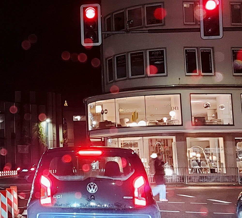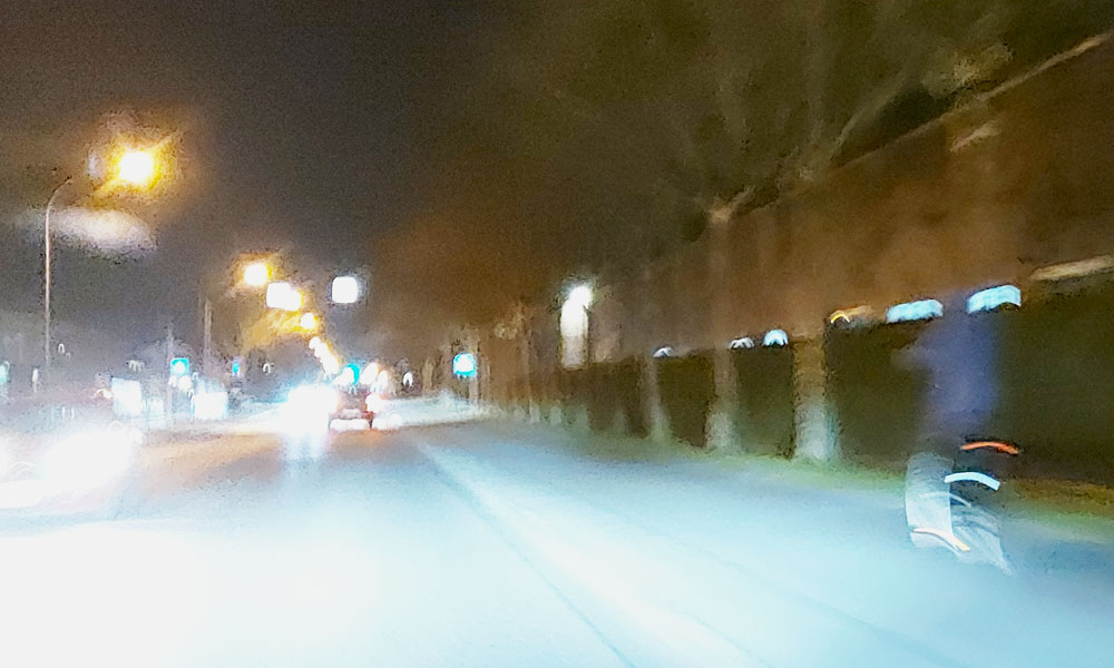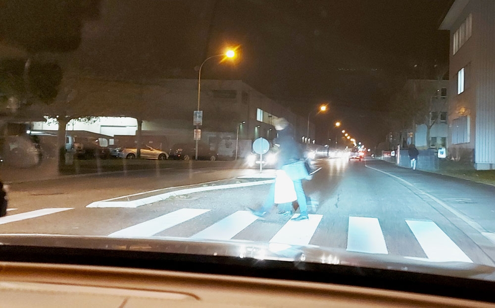 Kürzlich überquerte im Dunkeln eine Fußgängerin den Fußgängerübergang Fellingshäuser Straße an der Sporthalle Rodheim, obwohl für sie die Ampel rot zeigte. Winfried konnte in allerletzter Sekunde auf die Bremse treten. Die Dame war sich keiner Schuld bewusst, aber völlig schwarz gekleidet. Das ist auch ein Grund, warum die Fotos so miserabel wurden: Ich habe die Leute immer sehr spät gesehen. Aber sie spiegeln genau die Situation für den Menschen am Steuer wider. Und ich habe in den letzten Wochen verstärkt auf die Kleidung geachtet. Dunkel bis Schwarz ist immer noch Trend, bei jungen Leuten, bei Kindern, aber auch bei sehr vielen Senioren. Die Modefarben dieses Herbstes sind freundlicher und besser sichtbar.