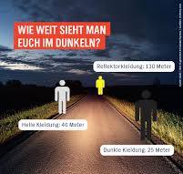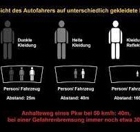 Eine dunkel gekleidete Person ist jedoch nur 25m weit sichtbar. Sie wäre sicher Opfer eines Zusammenstoßes. Bei der hell gekleideten Person kann die Sache glimpflich ausgehen. Nur die Person mit Reflektorkleidung wird so lange im Voraus gesehen, dass Autofahrer/in bremsen kann.