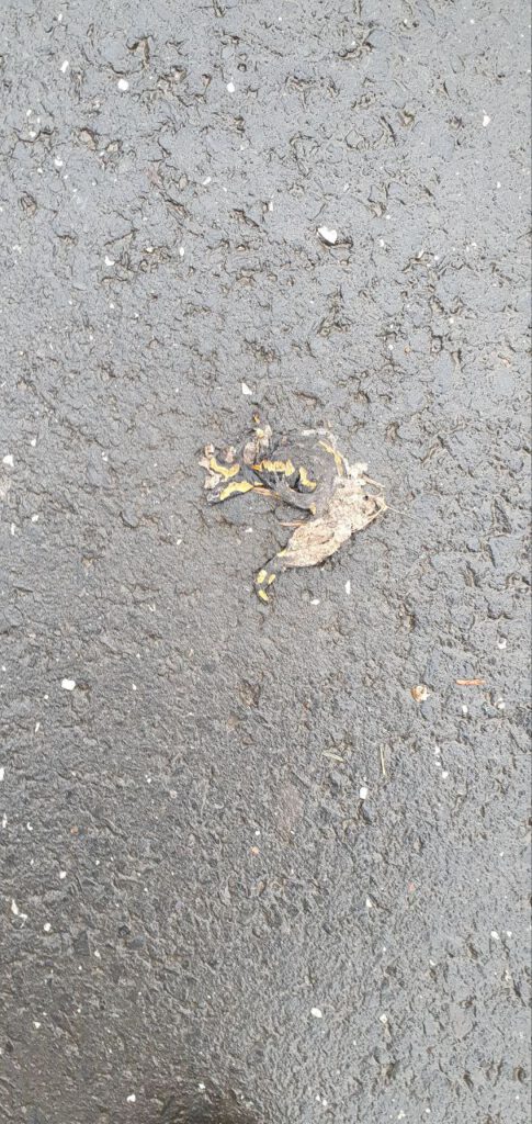 Das aber hält kaum jemanden ab, die nur für Anlieger freie Straße als kurzen Weg zur Gastsätte „Zur Post“ zu nutzen – insbesondere in den folgenden Wochen der Amphibienwanderung und der Theateraufführungen des TSV-Theaterstückes „Der verfluchte Baron“ von Mitte bis Ende April 2023. Diese drei Funde auf einer Strecke von nur 100 m stammen aus der regenreichen Zeit vor Ostern etwa in der Mitte der Marschallstraße zwischen Bachstraße und der Gaststätte „Zur Post“.