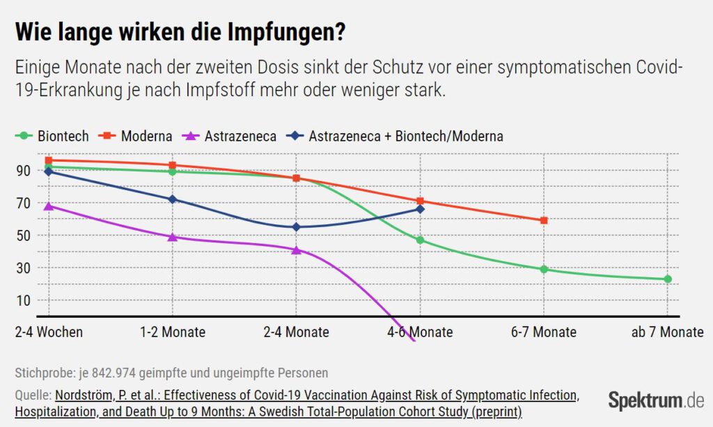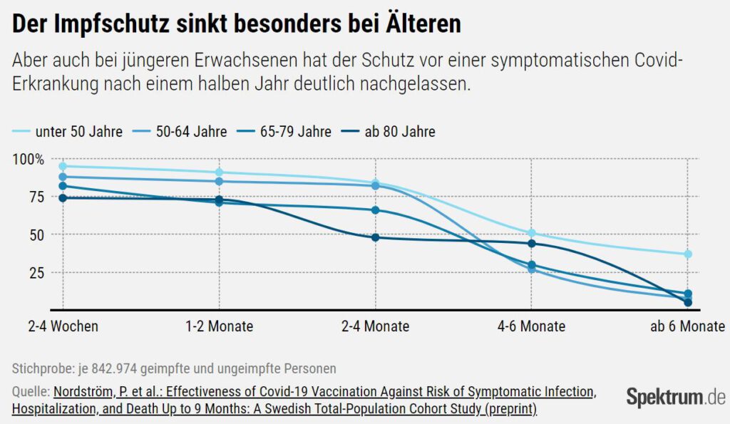 Nach 6 Monaten ist der Impfschutz bei Älteren über 50 Jahr bereits unter 25% abgesunken. Also Zeit für eine Booster-Impfung.
