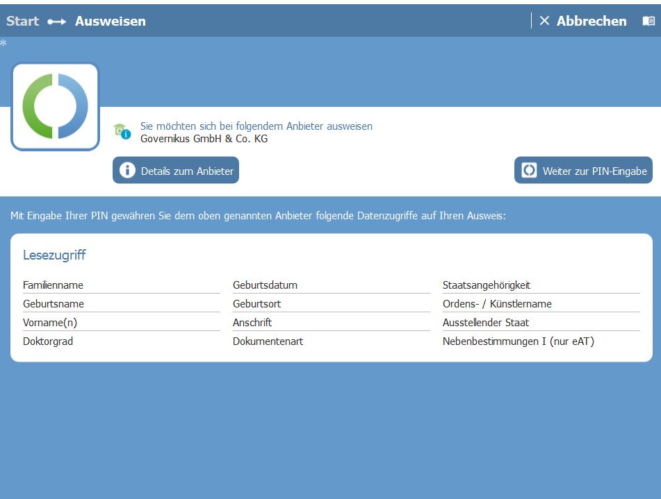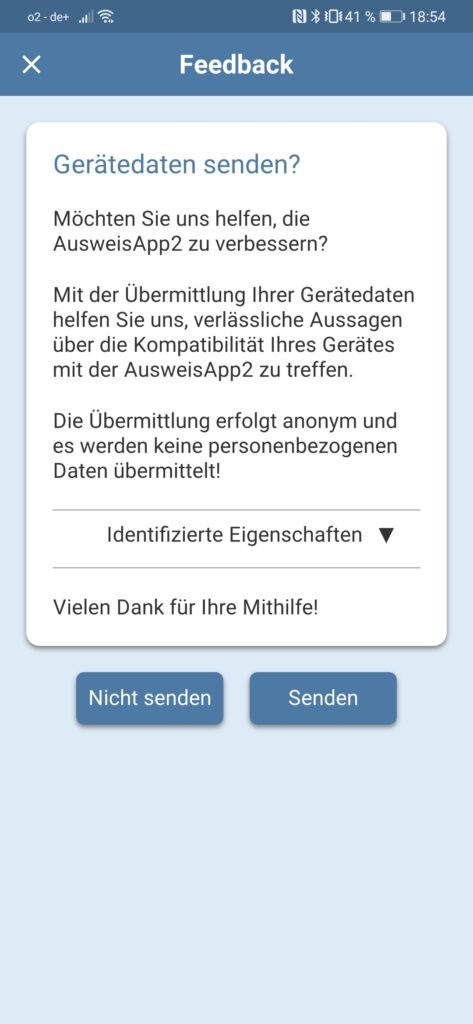 So die App ist installiert, der Pin ist endlich bekannt und man hat eine Firma, ein Amt oder sonst etwas, wo man sich ausweisen muss. Mit der PIN-Eingabe werden dem Anbieter obige Daten übermittelt. Wenn man sein ok gegeben hat und alle Daten übermittelt wurden, wird man noch gefragt, ob man helfen möchte die App zu verbessern.