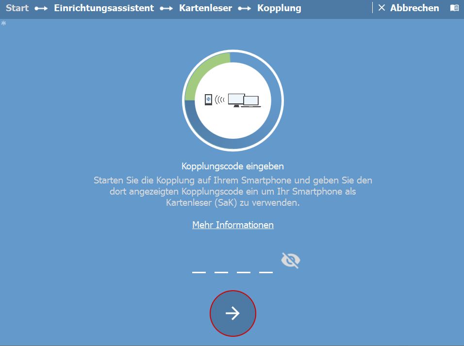 Um dort allerdings seinen Ausweis einzulesen benötigt man wiederum ein Kartenlesegerät. Aber auch eines, wo die großen Ausweise rein passen oder modern mit NFC ausgestattet ist. Mit meinem Lesegerät ging es leider nicht. Deshalb habe ich mein Smartphone als Lesegerät verwendet. Dieses musste ich nur mit dem PC koppeln. Das geht allerdings nur, wenn beide Geräte sich im gleichen W-Lan befinden. Um auch dort die Sicherheit zu erhöhen, muss man einen Kopplungscode eingeben. Der erscheint in großer Schrift auf dem Handy.