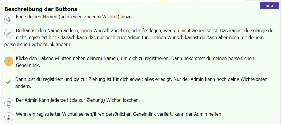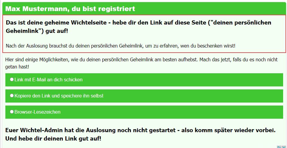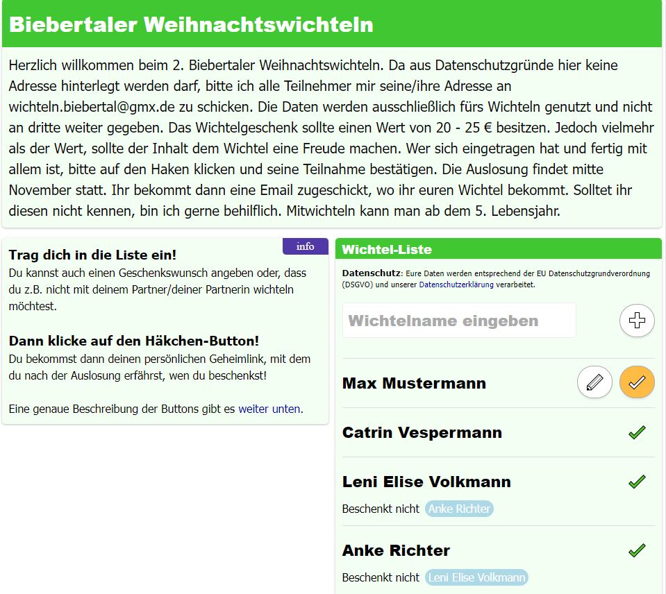 Dazu wurde auf https://wichtelmania.com/g/AJCenZmTM4np4q eine Wichtelgruppe angelegt. Über diese erfolgt auch die Auslosung. Das Wichtelgeschenk sollte nicht mehr als 20-25 € kosten. Vielmehr soll es dem Beschenkten eine Freude bereiten und die kann mit Sicherheit auch mit kleinem Geld erzeugt werden. Eine genauere Anleitung zur Anmeldung mit Screenshots findet ihr weiter unten.