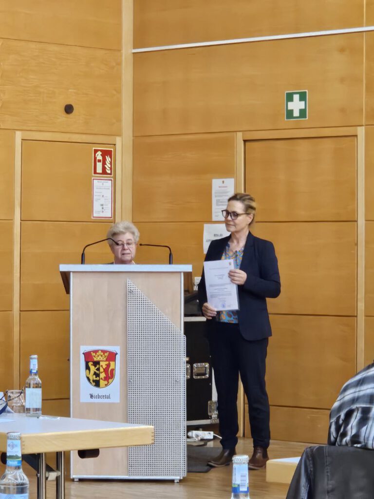 In der 1. Gemeindevertretersitzung des Jahres 2024 wurde Patricia Ortmann am 27. Febr. für ihre zweite Amtsperiode ab dem 1. März 2024 durch die Vorsitzende der Gemeindevertretung Elke Lepper nach § 47 HBG vereidigt: