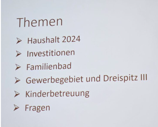 Bürgermeisterin Patricia Ortmann ging in einem Vortrag auf die links zu sehenden Themen ein, um die Vorhaben der Gemeinde für die Bürger verständlicher zu machen. An Ende der Bürgerversammlung (die um 19.00 Uhr begann und erst um 22.30 Uhr endete) beantwortete sie die schriftlich eingegangenen Fragen und zum Schluss die spontan noch aus dem Publikum vorgebrachten Fragen, Einlassungen und Vorschläge.
