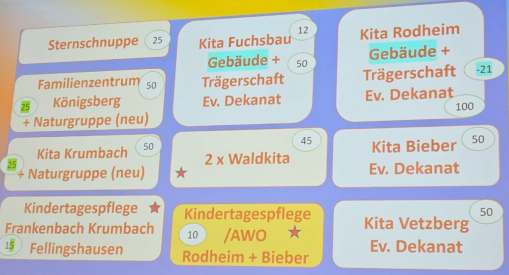 Oben zu sehen sind die aktuellen Kindergruppen mit den derzeit dort betreuten Kindern, sowie die vorgesehenen Plätze, die zum Teil in diesem Jahr noch eröffnet werden – wie die Kindertagespflege im ehemaligen Volksbankgebäude in Fellingshausen. Mitarbeiterinnen sind ab Mitte des Jahres verfügbar.