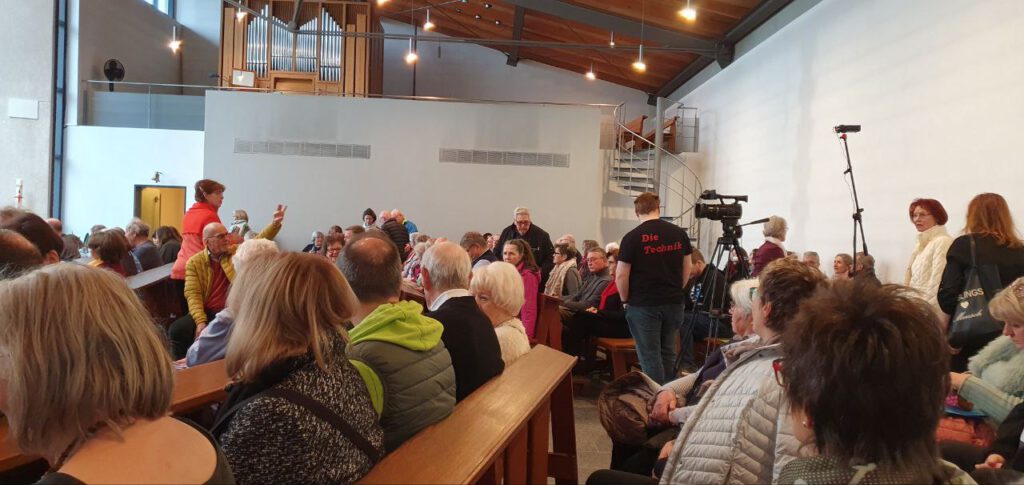 Mehr noch, als unten im Bild zu sehen, waren die Kirchenränge vollends besetzt und die Stimmung erwartungsvoll gespannt. Wie schon zuvor berichtet waren der Einladung zum Projektchor in diesem Frühjahr 40 Sängerinnen und Sänger aus der Region gefolgt.