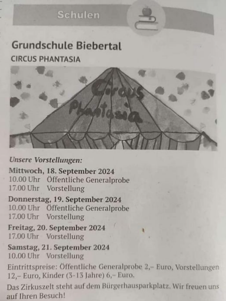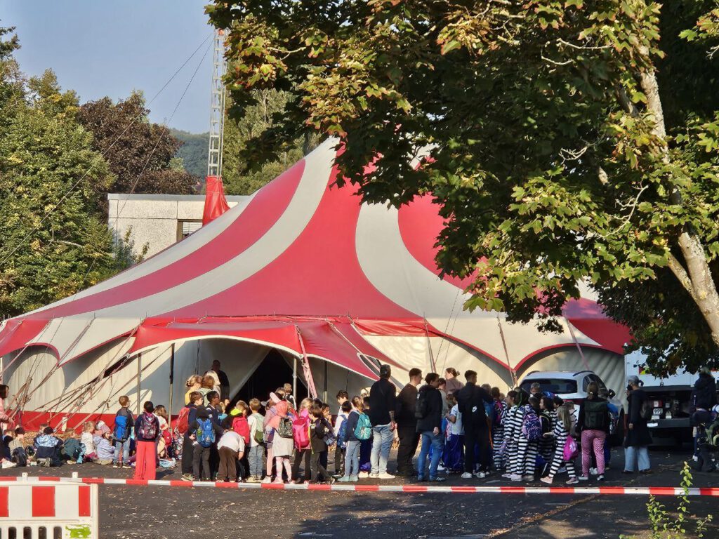 Dass die Schüler/innen beim Zirkusprojekt >Circus Phantasia< vor dem Rathaus in Rodheim viel Spaß hatten, war weithin hörbar. Beim Blick in das Zelt war es über und über voll mit Kindern – in der Manege und auf den Rängen. Auch die Lehrerinnen, die ich nach der Vorstellung sah, machten einen zufriedenen Eindruck.