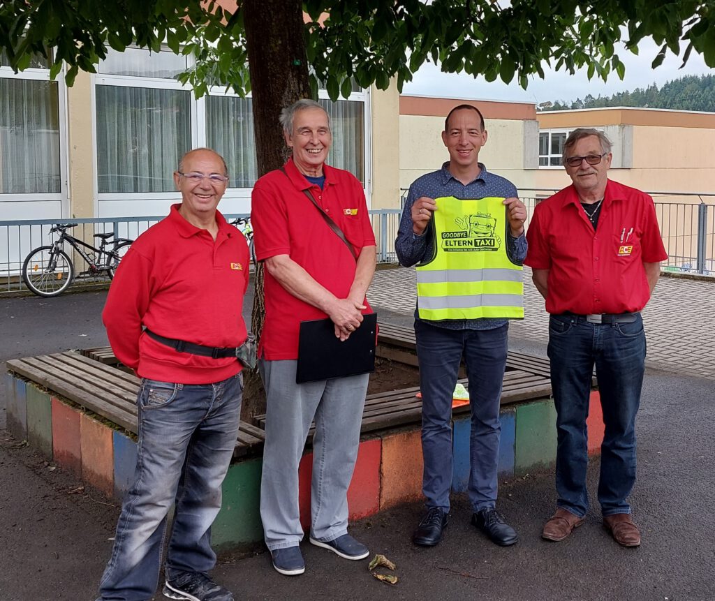 Im Anschluss überreichte Gerd dem Konrektor Sascha Ried Warnwesten für die Erstklässler, sowie Reflektor Armbänder,