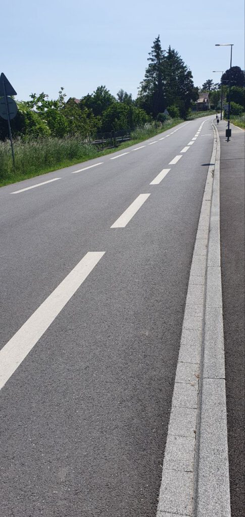 Im Elsass ist reichlich Radverkehr – auch von radelnden Urlauber/innen -, aber offenbar kein Konflikt mit motorisierten Fahrzeugen, die die volle Straßenbreite nutzen, wenn der Weg frei ist. Andernfalls wird auf die Radler Rücksicht genommen.