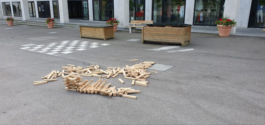 In der Schweiz – in Sursee – beobachtete ich auf einem Platz, wie von Kindern wie Erwachsenen Türme und Burgen aus den frei zugänglichen Spielhölzern gebaut wurden. Im zweiten Baukasten befanden sich die Spielfiguren für das Schachspiel am Boden.