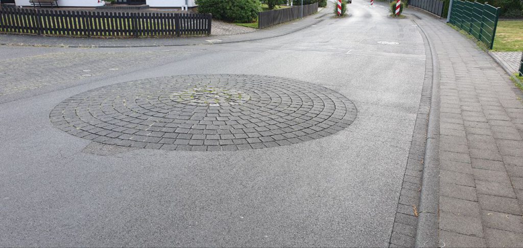 Selbst in Deutschlang – in Thomasberg im Siebengebirge – sind Mini-Kreisel als flache Inseln zur Verkehrsberuhigung an vielen Kreuzungen und Straßeneinmündungen möglich. Barken am Rand sorgen zusätzlich für langsames achtsames und rücksichtsvolles Fahren.
