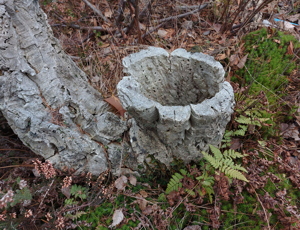 Moor mit Korkstamm, Moosen und Farnen im Winter