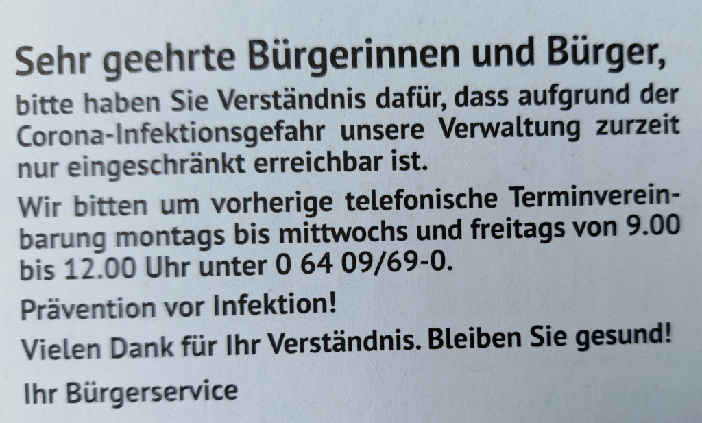 Der oben abgebildete Text erscheint seit etwa April, Mai 2020?? in den Biebertaler Nachrichten. Ich verstehe nicht, warum er immer noch abgedruckt wird, hatten wir in Biebertal doch seit Wochen eine Inzidenz von 0,0. (Seit gestern 21. Juli gibt es einen neuen „FALL“. Dieser eine Fall treibt die Inzidenz gleich auf 10.)