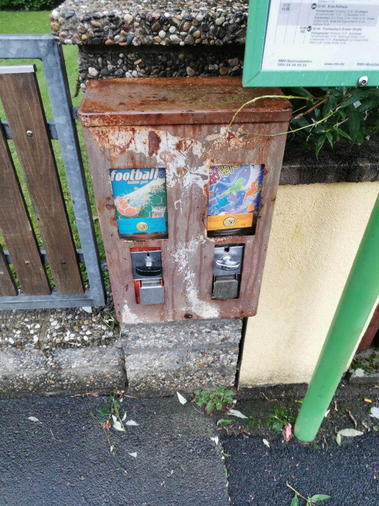 Dieser Automat sieht noch ziemlich neu aus, im Gegensatz zu dem aus Fellingshausen oder Rodheim. Das könnte aber auch daran liegen, das dieser nicht so frequentiert wird, da an einer Stelle, wo Fußgänger kaum Platz haben und dazu noch direkt an der Hauptstraße gegenüber der Tankstelle.
