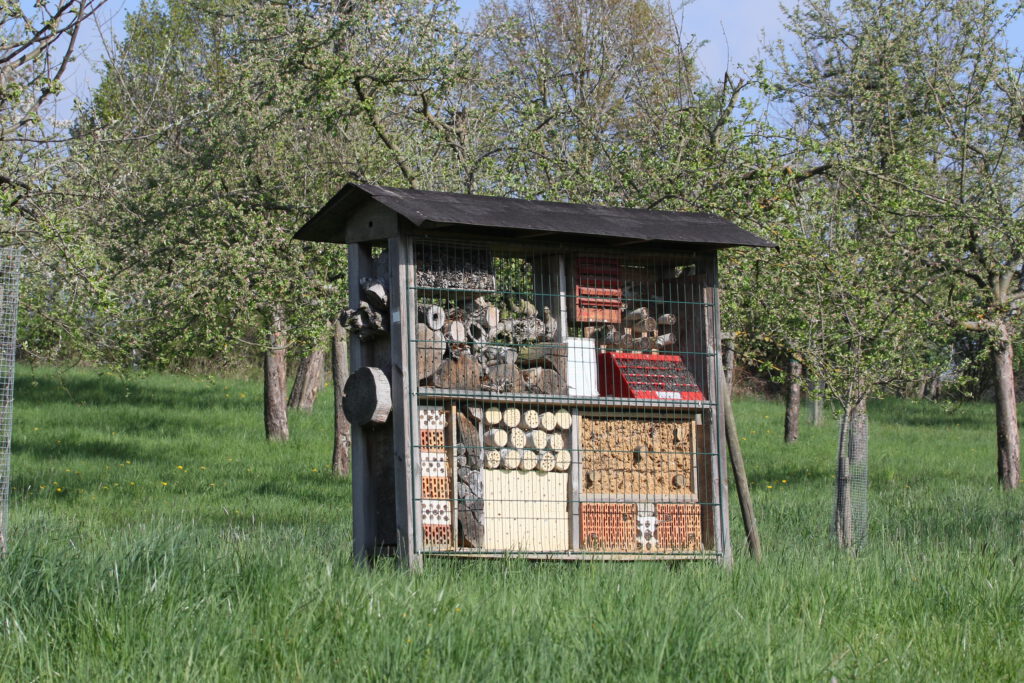 Solche einfachen Insektenbehausungen helfen der Natur, ihren Kreislauf aufrecht zu erhalten. Aber nicht nur Insekten benötigen die Streuobstwiesen, sondern auch viele andere Tierarten, wie Steinkautz, Schleiereule oder Fledermäuse.