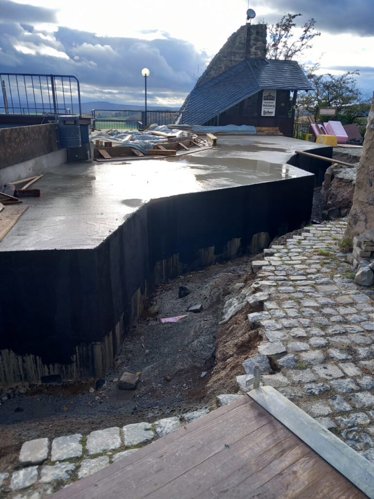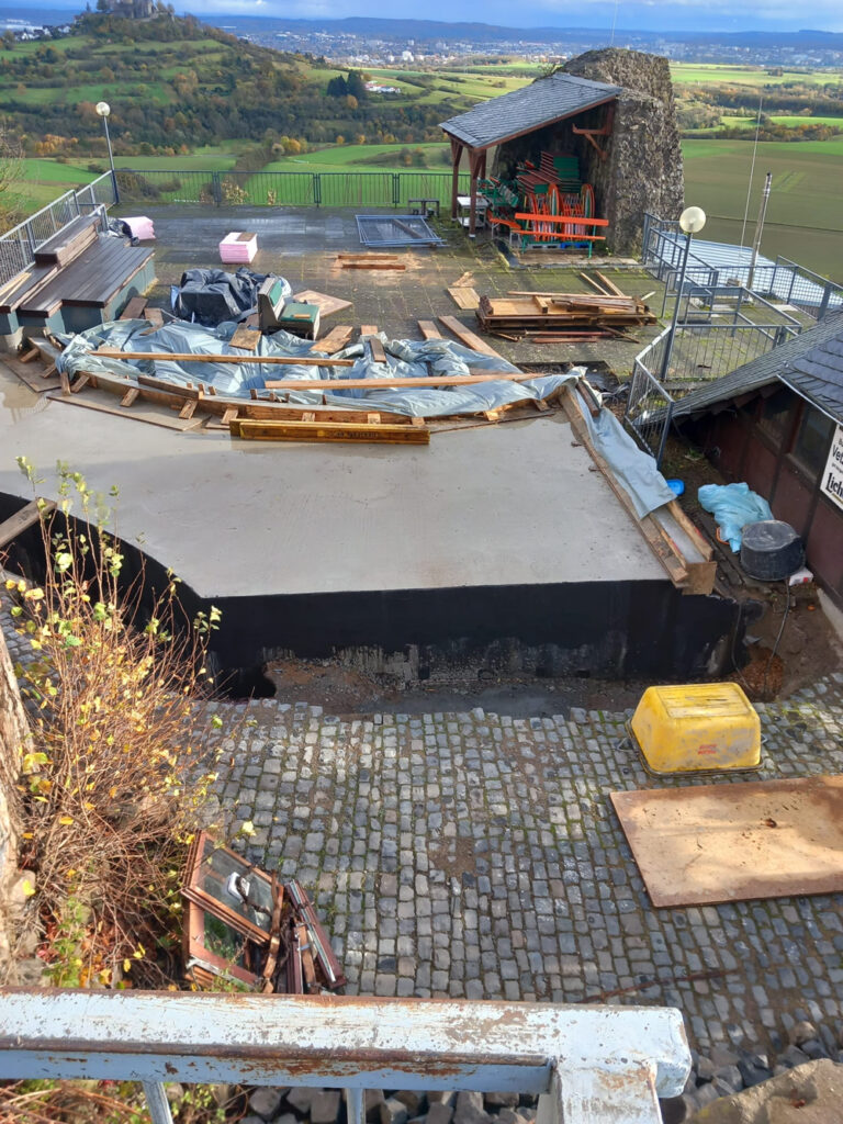 Falls Sie in den nächsten freien Tagen einen Ausflug nach Vetzberg planen: Dem steht nichts entgegen. Aber um die schöne Aussicht vom Burgturm zu genießen, müssen Sie sich gedulden. Im Zeitungsartikel von Anfang November konnte leider auch kein genauer Termin genannt werden. Die beiden Fotos unten zeigen Teile des Wasserbehälters. Der Himmel spiegelt sich im Regenwasser, und außerdem sieht man gut, was alles noch an Bauarbeiten zu bewältigen ist.