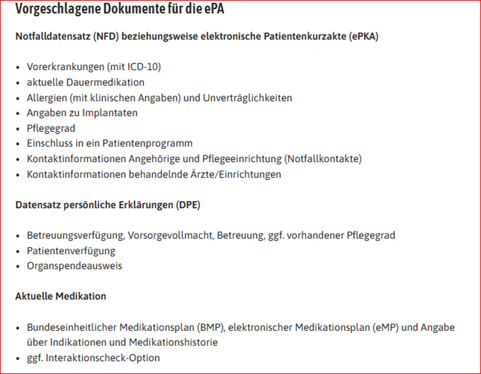 Daten zu weiteren Themenfeldern sollen dann zunehmend in der ePA gespeichert werden. Dazu zählen etwa persönliche Erklärungen wie der Organspendeausweis, die Patientenverfügung und die Vorsorgevollmacht oder Impfpass, Mutterpass, Medikationspläne, Laborbefunde, Aufnahmen von bildgebenden Untersuchungen, die Ergebnisse apparativer Untersuchungen, Arztbriefe zu stationären und ambulanten Behandlungen von Haus- und Fachärzten, Psychotherapeuten, Physiotherapeuten und anderen Heilberufen, Zahnbonusheft, usw..