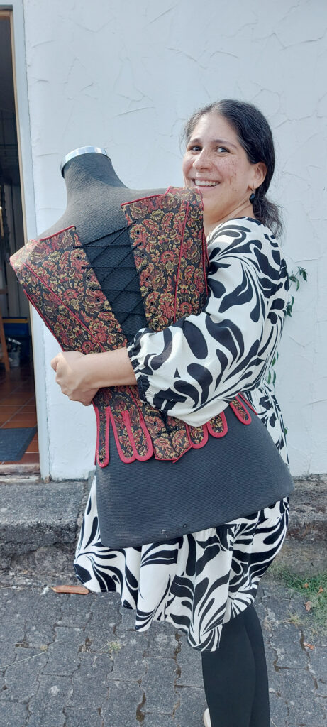 Manuela Brandl kam einige Minuten später an ihren Stand zurück. Sie erklärte mir den Unterschied zwischen einem Mieder und einer Corsage. Ausgestellt waren nur letztere. Sie werden als Oberbekleidung getragen, während das Mieder eine Unterbekleidung ist. Es wäre auch zu schade, diese wunderbar gearbeiten Kunstwerke zu verstecken.