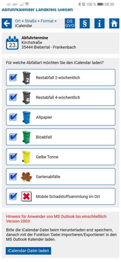 Habt ihr eure Müllsorten ausgewählt, klickt ihr auf das Symbol ICalendar Datei laden. Euer Smartphone möchte dann eine Datei herunterladen. Dies bitte bestätigen. Anschließend auf Öffnen klicken. Jetzt werdet ihr gefragt, ob ihr Termine aus dieser Datei importieren möchtet. Jetzt müsst ihr noch euren Kalender auswählen und dann die Daten importieren. In meinem Fall ist es der Huawei-Kalender. Wenn alles geklappt hat, sollten alle Abholtermine, die ihr ausgewählt habt, für das ganze Jahr im Kalender eingetragen sein. Ich nutze diese Art schon länger und muss somit nicht immer erst gucken, wo der Plan ist. Das Handy habe ich sowieso immer bei mir.