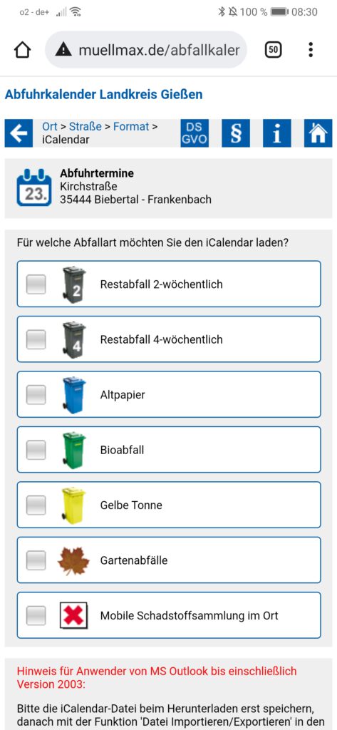 Im nächsten Feld erscheint die Auswahl, welche Müllsorten alles in den ICalendar erstellt werden sollen. Wie ihr im rechten Bild seht, nehme ich generell alle mit.
