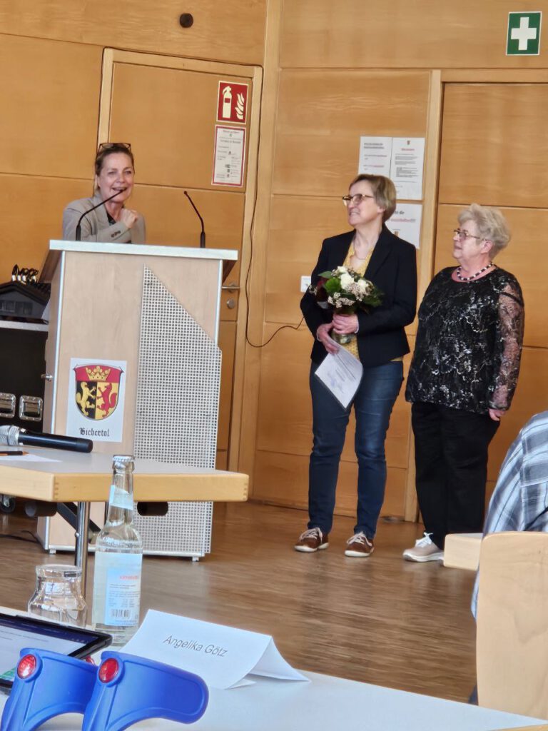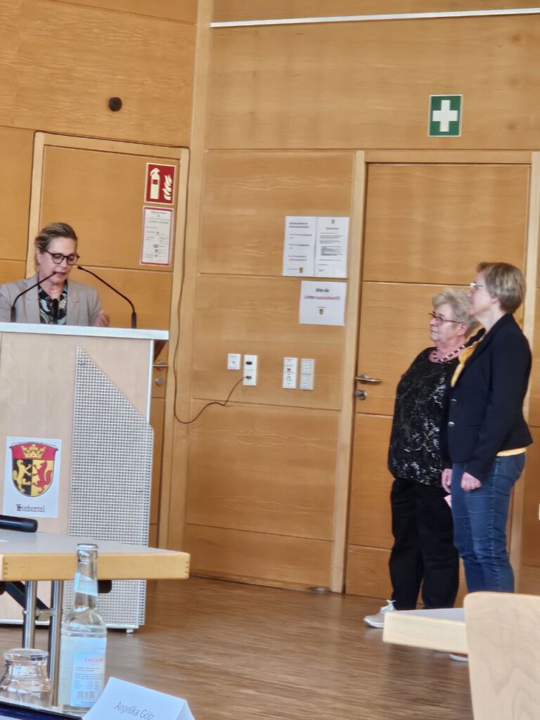 Nachdem die Gemeindevertreter/innen der Verleihung dieser Ehrenbezeichnung einstimmig zugestimmt hatten, hielt Frau Ortmann die Laudatio und würdigte das Schaffen von Frau Sonneborn in der Gemeindevertretung Biebertals sowie im Ortsbeirat Königsberg und weiteres ehrenamtliches Engagement im Geimeinsinn. Frau Lepper gratulierte als Vorsitzende der Gemeindevertretung; die Abgeordneten applaudierten.