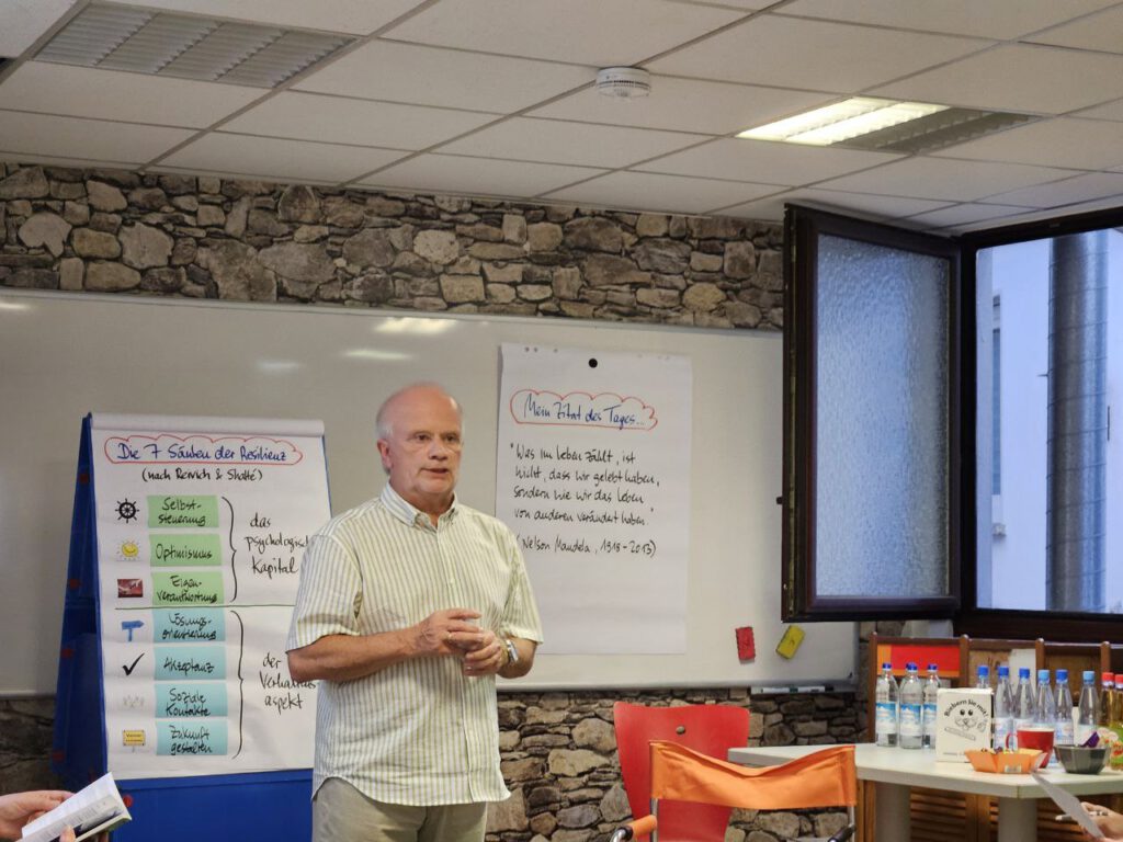 Weiter ging es über Merkmale von resilienten Persönlichkeiten hin zu den 7 Säulen der Resilienz – immer wieder unterbrochen von Zitaten und Anekdoten aus den Seminaren oder eigenen Eindrücken des Trainers.
