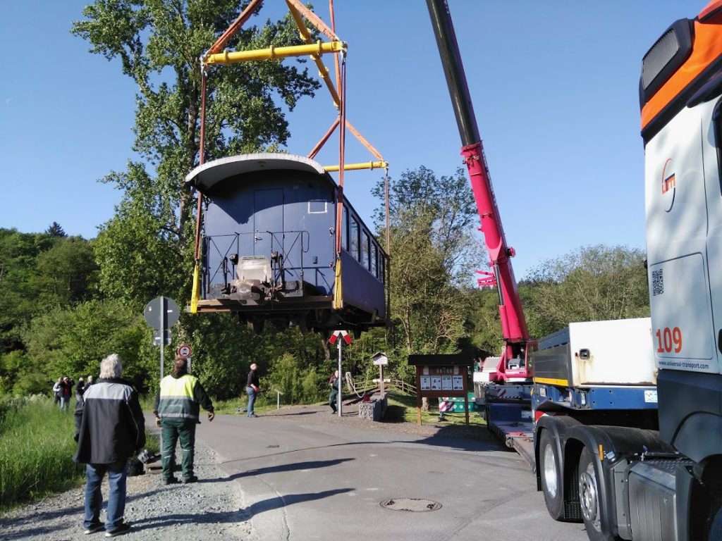 Freitag 15. Mai früh zwischen 7.30 und 9.30 bei der Schmitte: Schönstes Wetter, etwa 30 Schaulustige, ein riesiger Kran aus Stauffenberg, der 50 Tonnen heben kann, ein Langtransporter mit Gothaer Kennzeichen. Mittendrin der frohe Vorsitzende des Heimatvereins Rodheim-Bieber, Helmut Failing, der erleichtert und geduldig immer wieder von den Hindernissen beim Transport des Waggons und andere Geschichten um die Bieberlies erzählte. Lesen Sie weiter unter