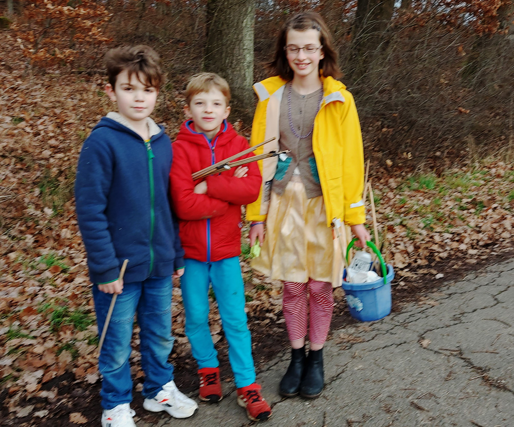 Das finden wir toll! Die drei hatten schon zu Hause in Bieber in ihrer Straße die Reste der Silvesternacht aufgesammelt und machten auf ihrem Spaziergang einfach weiter damit. Übrigens muss man die Holzstäbe nicht entsorgen. Man kann Pflanzen daran anbinden oder Holzkonstruktionen damit basteln. Aber in Emmas Eimer befanden sich auch Aludosen und Plastik. Offenbar gibt es Leute, die glauben, das würde alles zu Kompost werden. Stimmt nicht!