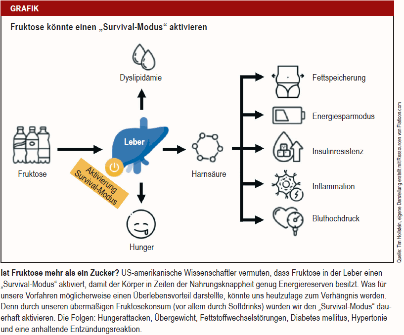 Neue Erkenntnisse lassen biochemische Zusammenhänge zur steigenden Adipositasraten erkennen: es könnte sein, dass Fruktose unseren Stoffwechsel auf einen „Survival-Modus“, also Notfall-Überlebensmodus umschaltet.