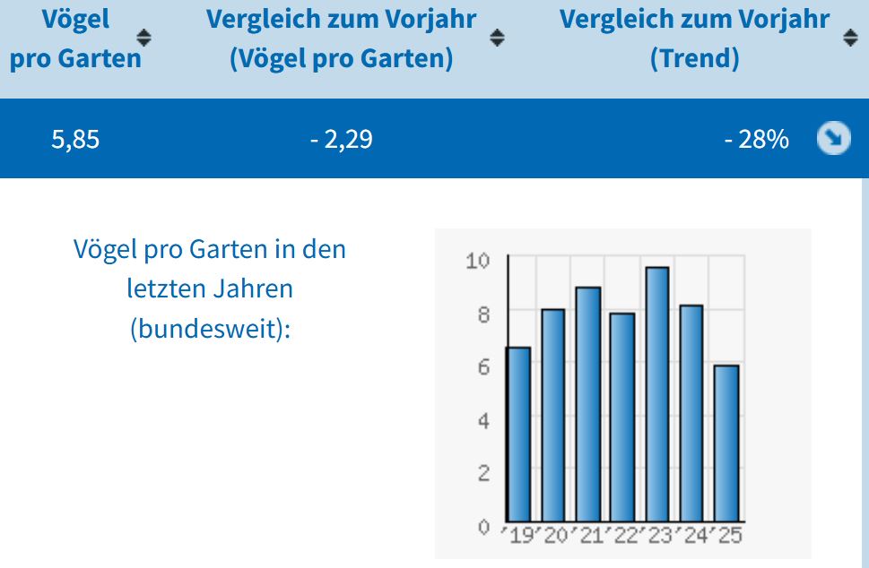 Bundesweit wurden in 84 138 Gärten 2 763 867 Vögel gezählt von 121 794 Vogelfreunden. Auffällig ist, dass nahezu in allen Bundesländern die Rangfolge Haussperling – Kohlmeise – Blaumeise – Amsel – Feldsperling heißt, eventuell sind mal Platz 2 und 3 oder Platz 4 getauscht.