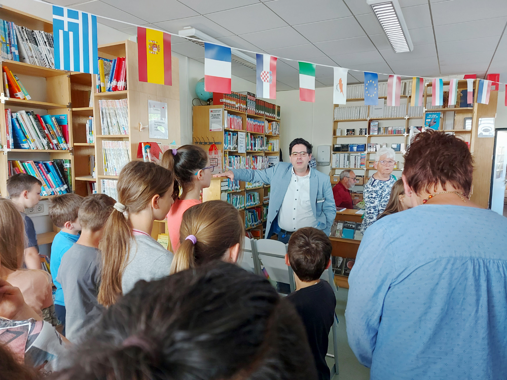 Der Auftakt der diesjährigen Europawochen fand auch in diesem Jahr wieder in den Räumen der Bücherei in der Schule am Bornberg in Rodheim statt. Michael Schär, persönlicher Referent von Regierungspräsident Dr. Christoph Ullrich begrüßte die Schülerinnen und Schüler Klasse 3a mit ihrer Lehrerin. Er erzählte den Kindern ein wenig über die Gründe zur Bildung eines vereinigten Europas. Die waren sowohl wirtschaftlicher Natur als auch aus dem Bestreben geboren, nach dem 2. Weltkrieg weitere Kriege in Europa zu vermeiden. Kein Kind wusste mehr, was ein Visum ist. Heute kann man in der EU eifach drauf los reisen. Früher gab es viele verschiedene Währungen, seit über 20 Jahren in vielen Staaten nur noch den €uro.