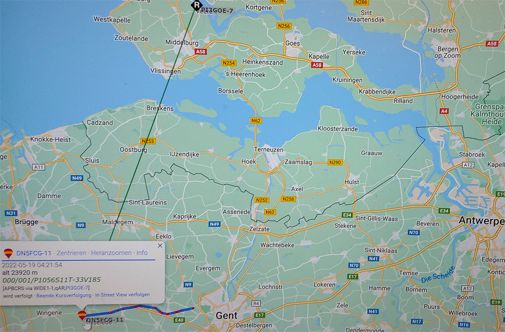 Aktuell weht der Wind von Ost nach West und der Ballon wurde 15 Std. nach dem Start von einer Amateurfunkstelle in den Niederlanden entdeckt. Er war auf dem Wege von Brüssel Richtung Gent und weiter in Belgien! Das Gießener Projekt ist jetzt damit wohl ein europäisches Projekt geworden.