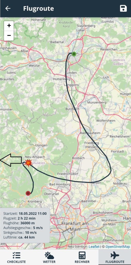 Die simulierte Flugroute rechts (vom 14. 5.) zeigt den erwarteten Verlauf der Flugroute einschließlich Platzen des Ballons und Sinkflug. Man sieht deutlich, dass im letzten Drittel des Aufstieges die Richtung des Ballons nach Westen dreht. Wenn das Platzen des Ballons dann aber nicht stattfindet, weil er die erforderliche Höhe nicht erreicht hat, dann wird sich der Ballon weiter in westliche Richtung bewegen, entsprechend den dort vorherrschenden Höhenwinden. Und so wird es geschehen sein: „Vom Winde verweht“