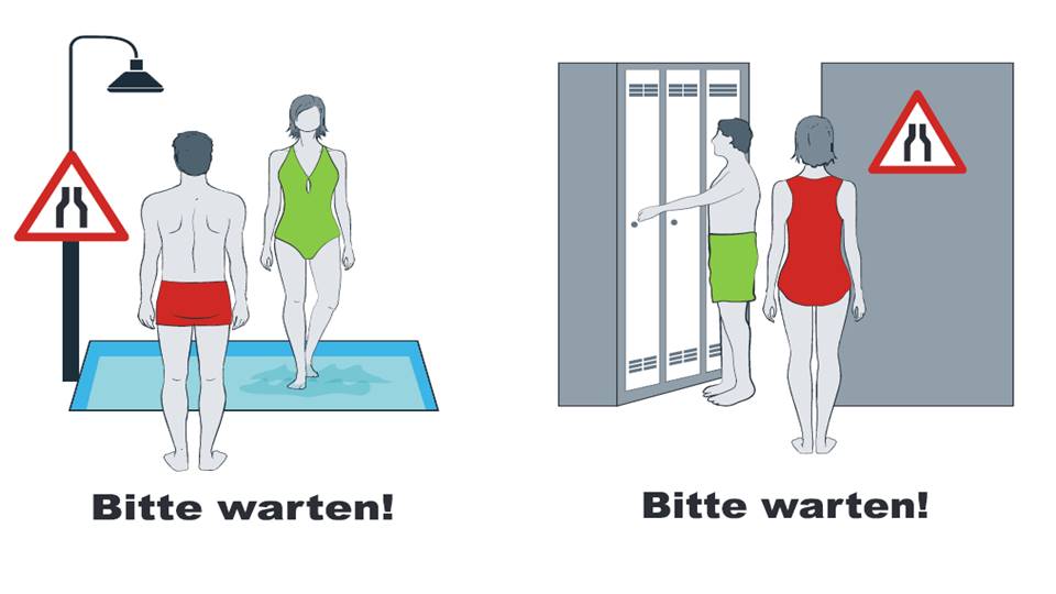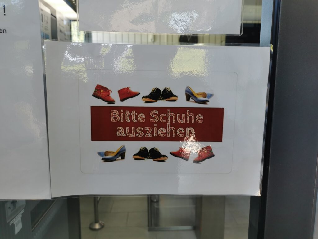 Bereits am Eingang muss man die Schuhe ausziehen. Zudem folgt das Eintreten in die Umkleidekabinen einem Einbahnstraßensystem. Es ist allerdings alles wunderbar ausgeschildert.