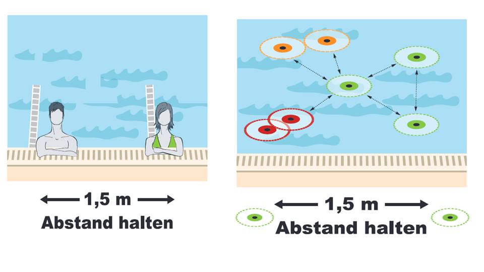 Auch im Schwimmbecken gilt die Abstandsregel. Daher wird das Schwimmbecken entsprechend aufgeteilt. Es werden zwei Doppelbahnen zur Verfügung stehen. Die Schwimmrichtung erfolgt im Kreisverkehr. Schwimmhilfen sind erlaubt. Nicht gestattet ist hingegen das Mitbringen von eigenen Wasserspielgeräten.
