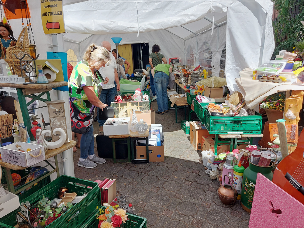 Das Angebot am 7. Juli 2024 war vielfältig; an einigen Ständen gab es sogar Warteschlangen. Man musste sich seinen Weg durch die Ausstellungsstücke bahnen. Etwas ruhiger ließ man es im hinteren Teil des Grundstücks angehen. Im Gegensatz zu 2022 war der Garten für Aussteller und Publikum geöffnet, was gut ankam. Aber statt vieler Texte lassen wir lieber Bilder sprechen. Außer den ca. 90 Hühnern und einem Sack voller Kuscheltiere war das Tierleben während des Flohmarktes ausgesperrt.