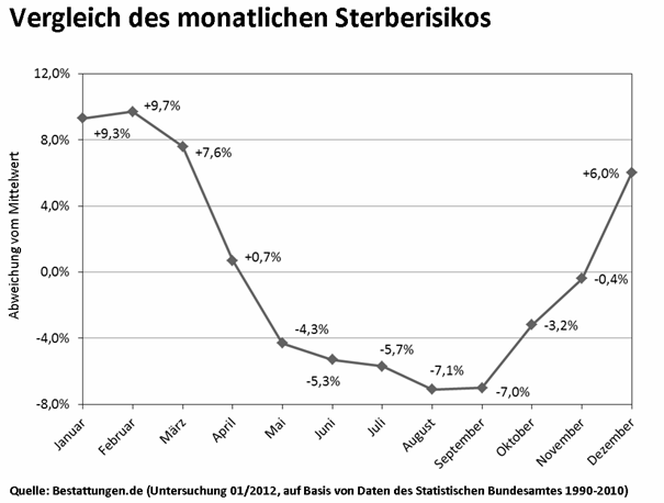 Wie die unten stehende Graphik zeigt, sind die kommenden Monate schon seit eh und je die Monate mit den meisten Todesfällen. Das fallende Laub, das scheinbar den Tod aller Pflanzen anzeigt, die kurzen Tage mit viel Regen, Nebel und wenig Sonnenschein – all das hat wohl auch dazu beigetragen, Totengedenktage im November zu  begehen. Belegt sind Allerheiligen und Allerseelen seit 998 (Dekret von Cluny).
