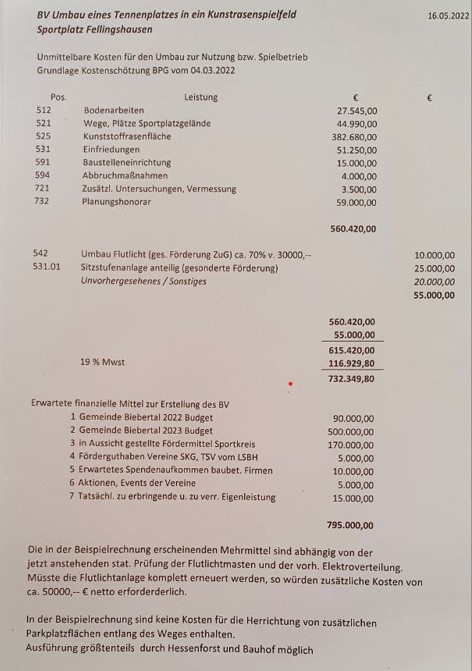 Dieser Aufstellung zeigt – aus Sicht der Vereine – eine solide Finanzierung des Kunstrasenprojektes in Fellingshausen: