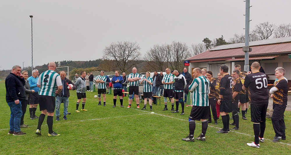 Ostersamstag auf dem Sportplatz in Frankenbach: Das von Christoph Haus organisierte Fußballspiel der Alten Herren Frankenbach/Vetzberg, Bereich Gehfussball, gegen GEHMANIA Okriftel kurz vor dem Start. Andreas Heuser aus Frankenbach heißt Mannschaften und Besucher/innen willkommen. Er begrüßt zudem unsere Bürgermeisterin und bedankt sich, dass sie ihr Wahlversprechen eingehalten und für neue Tore gesorgt hat. Eine Bemerkung neben mir „Hat das Geld nicht gereicht? Die Tore sind so klein!“ Dank kommt auch vom Vorsitzenden des Sportvereins Frankenbach, Norbert Bena. Von ihm gab es für den Organisator, den Schiedsrichter und für die Bürgermeistern einen Schokohasen. Kreisfußballwart Henry Mohr war ebenfalls angereist und übergab als Dank einen Ball. Holger Waldschmidt wurde noch für seine unkomplizierte und schnelle Hilfe bei Problemen im vergangen Jahr mit einer Flasche Wein beschenkt.