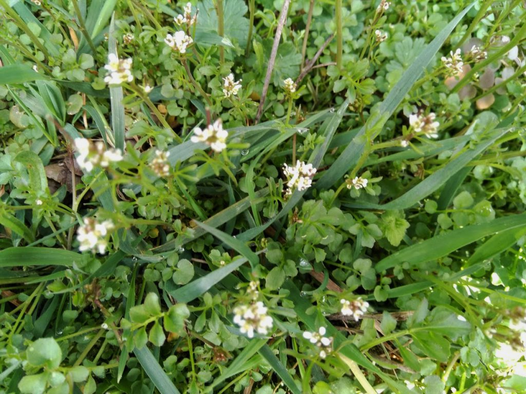 Das oberste Foto zeigt das Behaarte Schaumkraut (Cardamine hirsuta, Brassicaceae). Es wurde seit etwa 1975 in ganz Europa verbreitet und wächst fast ganzjährig. Als Unkraut ist es leicht durch hacken zu entfernen. Solange es nicht blüht, hat es einen wunderbaren Kressegeschmack und kann genauso verwendet werden. Wer gerne bitter isst, kann die zarten Blättchen in kleinen Mengen auch während der Blüte verwenden. Ansonsten freuen wir uns über den feinen weißen Schleier auf dem Erdboden und daran, dass die winzigen Blütchen Nahrung für winzige Insekten liefern.