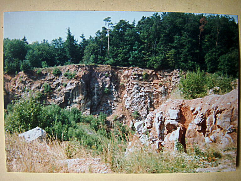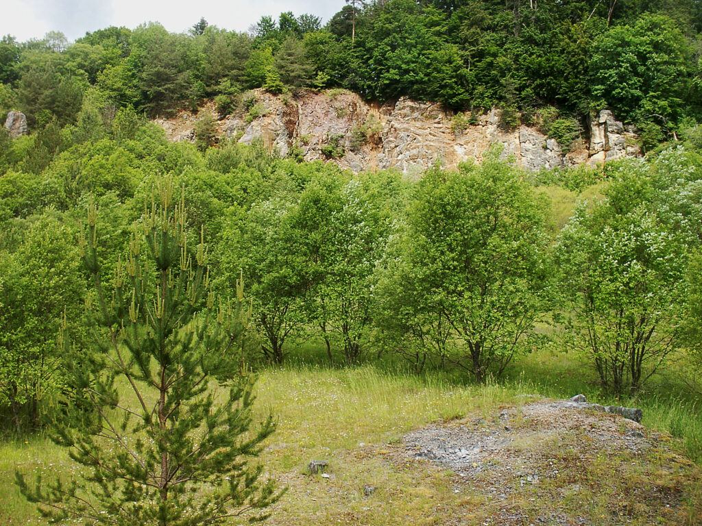 Knapp 30 Jahre ist es her, dass die Firma Westermann ihren Kalksteinabbau am Eberstein eingestellt hat. Zurück blieb, wie auf dem Foto von 1995 zu sehen ist, ein Krater mit schroffen Felswänden als tiefe Wunde in der Natur. Dazu hohe Abraumhalden von nicht verwertbaren Kalkstein.
