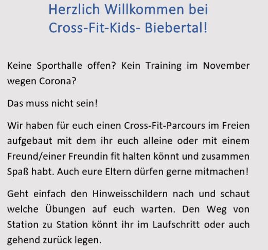 Mit unserem Parcours wollen wir in der aktuellen Phase, wo kein Vereinssport möglich ist, den Kindern in unseren Biebertaler Orten die Gelegenheit geben sich etwas an der frischen Luft zu bewegen und für sie spannende Bewegungsaufgaben zu lösen. Die Rückmeldungen bisher waren so positiv, dass wir schon einige weitere neue Stationen entwickelt haben, so dass die Kids den Parcours mit ihren Eltern und Geschwistern gerne 2-3x laufend oder joggend absolvieren können. Die Trainerinnen unserer Mini-Abteilung, insbesondere Carmen Hofmann und Katrin Reissner-Payer, haben hier ansprechende differenzierte Bewegungsaufgaben gestellt, die für Jung und Alt fordernd sein können.