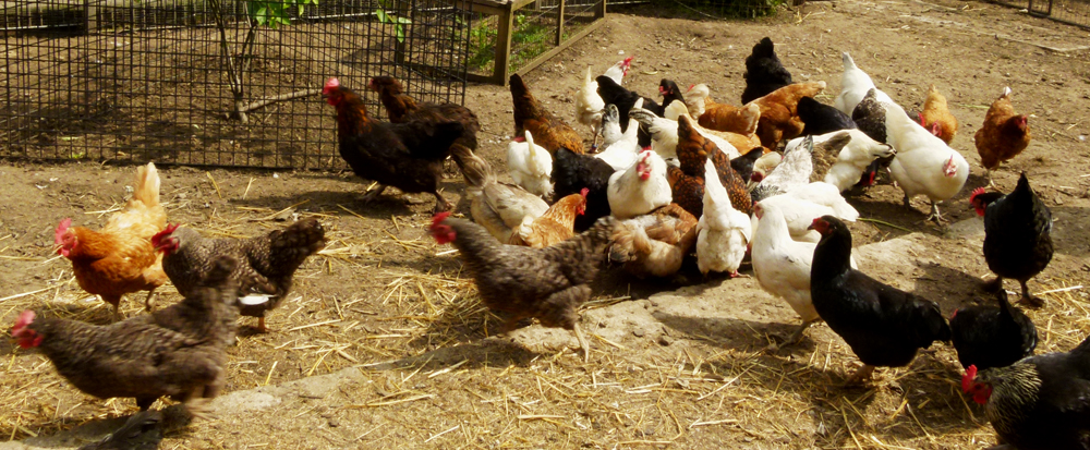 Die Hasen sind in Wirklichkeit Haus- und Zwergkaninchen, die Hühner sind Hennen, Küken und ein paar Hähne, und der Hund……