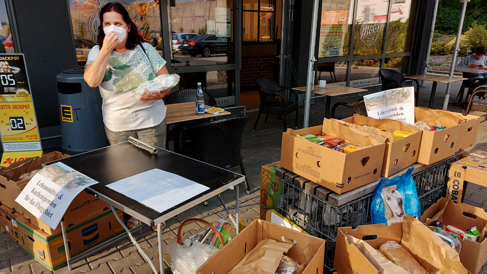 Die vielen einzelnen Hilfsaktionen haben sich kürzlich zusammen geschlossen unter dem Mantel der inzwischen gemeinnützigen Initiative „Wir Hessen helfen“. Der Aufruf, am 17. September in Biebertal diverse Spenden, ganz besonders auch Kuchen, vor den Edeka-Markt zu bringen, verhallte nicht ungehört. Während unserer zehnminütigen Anwesenheit wurden ganz viele Putzmittel sowie selbst gebackene Plätzchen angeliefert. Auch wenn z.B. in Gießen gar nichts gespendet wurde, so sorgen die Dörfer und Marburg dafür, dass der Transporter voll beladen ins Überschwemmungsgebiet fahren kann.