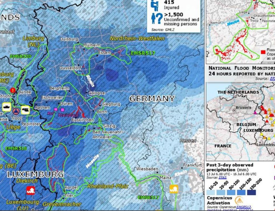 Zeichenerklärung: blaue Kästchen = Niederschlagsmenge in Litern vom 13. – 16. Juli 2021