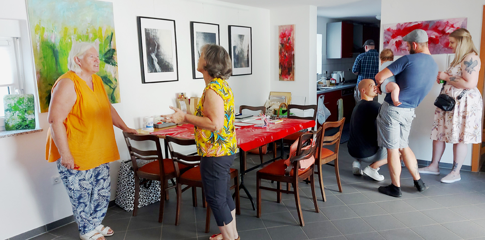 Besucher/innen am 24. August im Atelier in Bieber; einige wollen am Workshop Teil nehmen